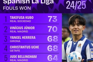 西甲被犯規(guī)數(shù):久保建英73次居首,維尼修斯70次第二&貝林64次第5