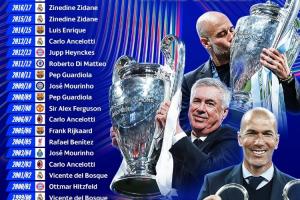 歐冠官方列出92/93賽季-23/24賽季的歐冠冠軍主帥,發(fā)問:你最喜歡哪一個(gè)?