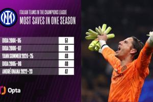 自相關(guān)數(shù)據(jù)統(tǒng)計(jì)以來,在代表意大利球隊(duì)單屆歐冠賽事?lián)渚劝裆?,只有AC米蘭的迪達(dá)(49次和51次)比他撲救更多。