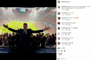 前巴黎球員貝克漢姆也來到現(xiàn)場觀戰(zhàn),他在個人社媒曬出現(xiàn)場照片祝賀巴黎,寫道:“創(chuàng)造歷史,恭喜巴黎!哇,多么不可思議的一場比賽?!?/p>
