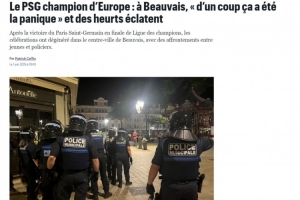 在歐冠決賽中,巴黎圣日耳曼5-0大勝國(guó)米,成功奪冠。巴黎圣日耳曼的球迷們?cè)诜▏?guó)各地慶祝,但在博韋卻發(fā)生了球迷騷亂。當(dāng)時(shí)一群球迷先是歡呼奪冠,然后開始侮辱馬賽人,并來到阿歇特廣場(chǎng)。而在拉法耶百貨附近,有大約20名防暴警察拿著盾牌維持秩序,之后局勢(shì)突然變得緊張。