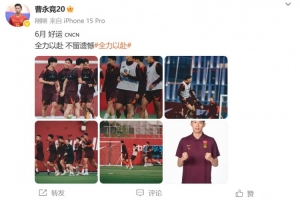 國足正在上海備戰(zhàn)最后2場世預賽18強賽,曹永競在社媒曬出訓練照,并配文:6月 好運 全力以赴 不留遺憾。