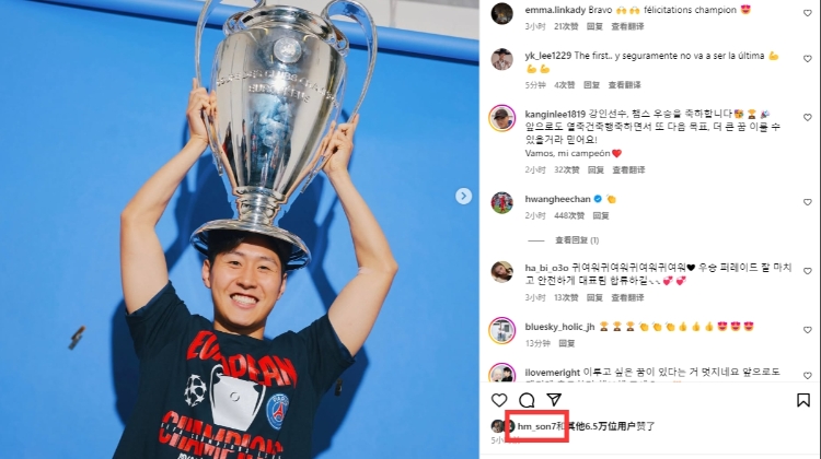 本賽季,熱刺奪得歐聯(lián)冠軍,此前孫興慜曬照慶祝時李剛仁也點了贊。