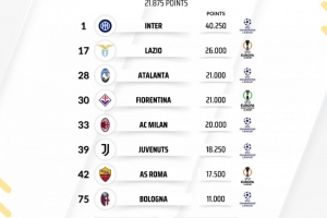 以下為2024-25賽季意甲球隊(duì)歐戰(zhàn)積分具體排名情況: