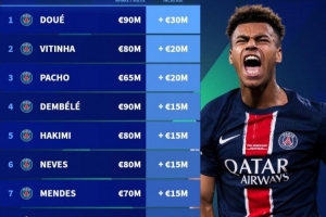 1、杜埃(巴黎圣日耳曼),現(xiàn)身價(jià)9000萬(wàn)(+3000萬(wàn))