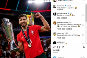 魯本-迪亞斯此役為葡萄牙踢滿120分鐘,賽后他在社交媒體上曬出手拿獎(jiǎng)杯的照片,配文:“歐國聯(lián)冠軍X2??”