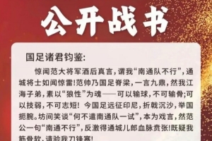 7日,網(wǎng)上出現(xiàn)了一篇名為《南通草根足球隊致中國國家男子足球隊公開戰(zhàn)書》的文章,文章稱:“驚聞范大將軍酒后真言,謂我‘南通隊不行’,通城將士如聞驚雷!”隨后文章以“南通草根足球隊”的名義向國足下戰(zhàn)帖,要求約定時間地點、規(guī)則尺度等。文章表示,若南通隊敗,全隊登報敬告天下:“范帥慧眼,吾輩確遜國足!”若國足負(fù),只求諸君一句:“南通,可戰(zhàn)!”