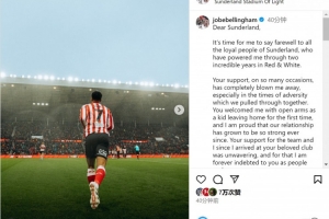體育資訊6月10日訊 喬布-貝林厄姆更新社媒動態(tài),與桑德蘭告別。