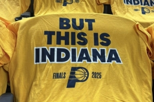 賽前,場館內的座位上鋪滿了步行者的黃色助威T恤,上面印有“但,這里可是印第安納!”的字樣。