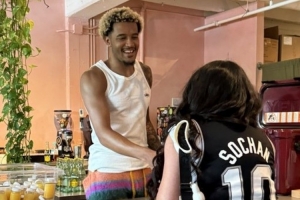 體育資訊6月12日訊 今日馬刺球員索漢在圣安東尼奧的一個酒吧參加了社區(qū)活動,給粉絲免費榨果汁。