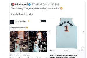 賽后,文班和現(xiàn)場(chǎng)的一位小球迷互換了球衣。但是有網(wǎng)友發(fā)現(xiàn),文班的這件球衣近期已經(jīng)被擺上了海外的專(zhuān)業(yè)拍賣(mài)平臺(tái)(Goldin)。