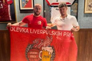 在會(huì)場中,科爾克茲與博主一起拉起匈牙利紅軍球迷的旗幟,并且在利物浦球衣上簽上自己的名字。