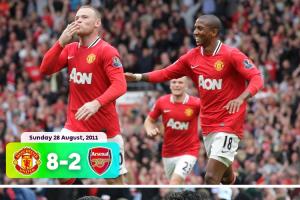 2011年8月28日23:00,2011/12賽季英超第3輪,曼聯(lián)主場(chǎng)8-2血洗阿森納,魯尼戴帽,阿什利-揚(yáng)梅開二度,維爾貝克、納尼、樸智星各入一球。沃爾科特和范佩西進(jìn)球?yàn)榘⑸{挽回顏面。德赫亞還撲出了范佩西射出的點(diǎn)球。