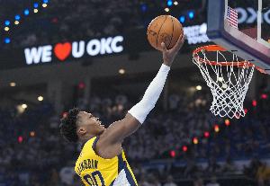 體育資訊6月23日訊 總決賽搶七上半場,步行者48-47雷霆。