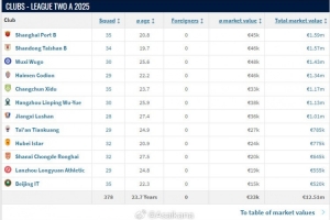 德國(guó)轉(zhuǎn)會(huì)市場(chǎng)網(wǎng)(TransferMarkt.de)2025年中中乙球員身價(jià)例行更新今日已上線。