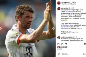 體育資訊6月25日訊 世俱杯小組賽,C組第3輪,拜仁0比1不敵本菲卡。賽后,穆勒更新社媒鼓勵球隊在淘汰賽中繼續(xù)前進(jìn)。