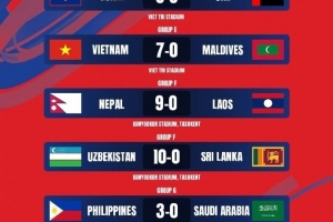 此外,還出現(xiàn)了多場(chǎng)比分差距較大的比賽,具體為:泰國(guó)女足7-0擊敗伊拉克女足,緬甸女足8-0擊敗土庫(kù)曼斯坦女足,中國(guó)臺(tái)北女足8-0擊敗巴基斯坦女足,孟加拉國(guó)女足7-0巴林女足,越南女足7-0馬爾代夫女足,尼泊爾女足9-0老撾女足。