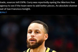 “突發(fā)新聞:據(jù)ESPN消息人士透露,金州勇士隊(duì)球星斯蒂芬-庫里已申請(qǐng)交易。據(jù)報(bào)道,庫里正在關(guān)注勇士隊(duì)自由球員市場,看看球隊(duì)能否引進(jìn)更優(yōu)秀的球員。今晚舊金山灣區(qū)發(fā)生了一件絕對(duì)令人震驚的事?!盋hef Curry杜撰寫道。