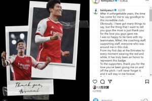 體育資訊7月4日訊 富安健洋更新社媒動(dòng)態(tài),與阿森納告別。
