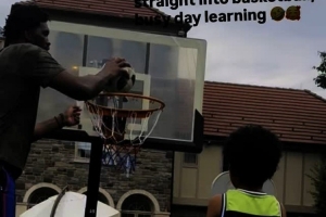 配文寫道:“從足球訓(xùn)練迅速切換到了籃球,忙碌的學(xué)習(xí)日。”