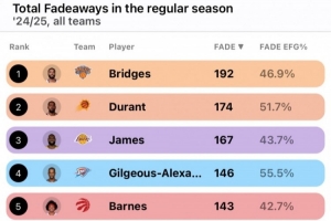 體育資訊7月10日訊 美媒NBA University在社交媒體上曬出了上賽季常規(guī)賽NBA球員后仰投籃次數(shù)榜,以及這些球員的后仰投籃的有效命中率。