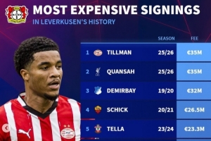 體育資訊7月12日訊 埃因霍溫中場(chǎng)蒂爾曼已經(jīng)官宣轉(zhuǎn)會(huì)勒沃庫森,《轉(zhuǎn)會(huì)市場(chǎng)》統(tǒng)計(jì)顯示他也并列為藥廠隊(duì)史標(biāo)王。