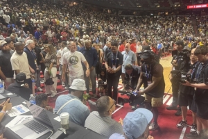 而從圖片可以看出,詹姆斯入座后身前就擠滿了攝影師,一個(gè)個(gè)鏡頭都對(duì)準(zhǔn)了詹姆斯。