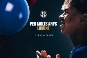 巴薩官推今天曬出了球員的海報(bào),并寫道:“生日快樂,拉明??????”