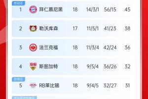 體育資訊01月19日訊 德甲第18輪今晚結(jié)束多場(chǎng)比賽,其中領(lǐng)頭羊拜仁主場(chǎng)3-2戰(zhàn)勝沃爾夫斯堡,先賽領(lǐng)先身后的勒沃庫(kù)森7分。