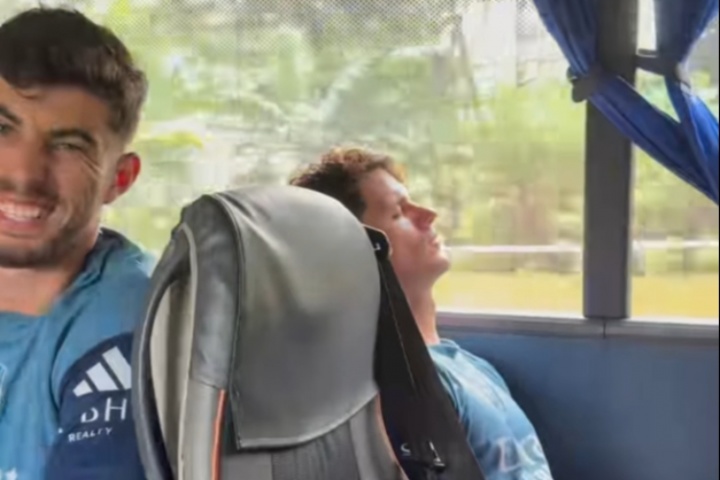 視頻中阿森納一眾小年輕在大巴上唱跳打鬧拍窗戶,31歲的新援諾爾高只覺(jué)得吵鬧,自己眉頭緊鎖閉目養(yǎng)神。
