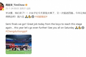 周定洋在個人微博中寫道:半決賽,我們來了?。⌒』镒觽兘裉毂憩F(xiàn)太棒了,又一次挺進四強… 今年讓我們走得更遠吧!周六見 ??????