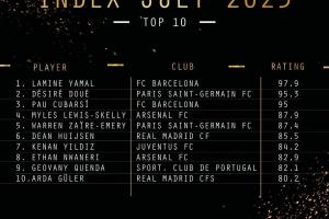 注:金童足球基準(zhǔn)指數(shù)值基于球員在2024年10月7日至2025年7月13日期間的表現(xiàn);球員選拔僅考慮2005年1月1日及之后出生的球員。