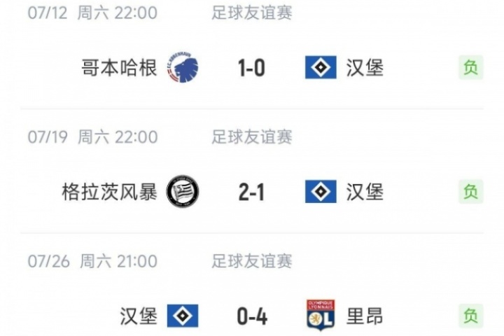 今夏的友誼賽,漢堡已經(jīng)遭遇三連敗了,三場比賽只進(jìn)1球。剛升級德甲的漢堡這三場比賽分別是:0-1不敵丹超豪門哥本哈根,1-2不敵奧甲新貴格拉茨風(fēng)暴,0-4不敵法甲豪門里昂。