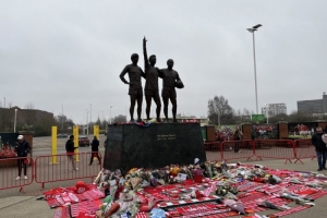 據(jù)記者西蒙-斯通報道,球迷們將鮮花和圍巾擺放在老特拉福德外的雕像前面,悼念去世的曼聯(lián)名宿丹尼斯-勞。