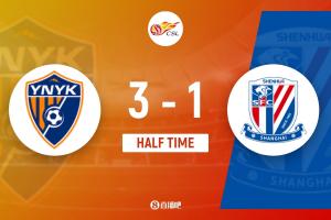 上半場比賽結(jié)束,上海申花客場暫時(shí)1-3落后云南玉昆。