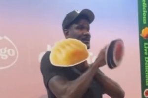 活動(dòng)現(xiàn)場,艾頓盡情展現(xiàn)搞怪一面,拿著贊助商產(chǎn)品手牌花式應(yīng)援。