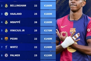 體育資訊8月7日訊 金球獎30人候選名單公布,德轉(zhuǎn)也盤點(diǎn)了30人身價榜單,其中亞馬爾2億歐居首,具體如下(身價相同年齡小者在先):