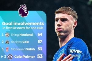 體育資訊1月21日訊 英超官方統(tǒng)計(jì)了效力單一球隊(duì)前50場英超首發(fā)制造進(jìn)球榜單,帕爾默為切爾西制造53球并列第三。