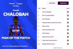 賽后英超官方宣布,查洛巴獲得了55.5%得票率,當(dāng)選全場(chǎng)最佳球員。庫(kù)庫(kù)雷利亞獲得20.6%得票率,排名第二。