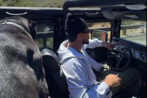 體育資訊8月19日訊 近日單身的太陽隊球星德文-布克駕駛悍馬出游,狗狗陪伴在他的身邊。