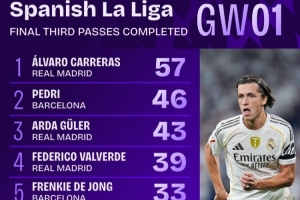 體育資訊8月21日訊 西甲首輪戰(zhàn)罷,Squawka統(tǒng)計(jì)球員在進(jìn)攻三區(qū)完成傳球次數(shù),A費(fèi)57次居首,佩德里、居勒爾分列二三位。