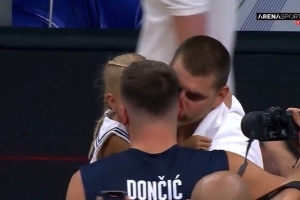 賽后約基奇與東契奇親密互動,前者親吻了后者的臉頰。