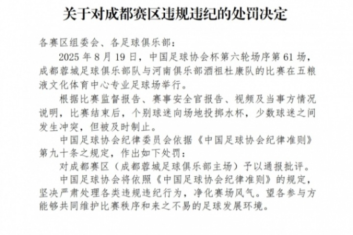 2025年8月21日,成都市公安局金牛區(qū)分局發(fā)布警情通報(bào),足協(xié)杯半決賽后滋事三人被行政拘留。