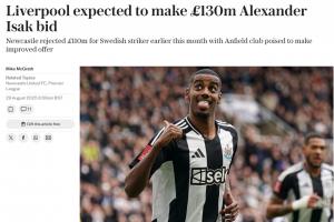 體育資訊08月29日訊 據(jù)英國(guó)媒體《每日電訊報(bào)》報(bào)道,利物浦將提出對(duì)伊薩克的第二份報(bào)價(jià),轉(zhuǎn)會(huì)費(fèi)預(yù)計(jì)超過(guò)1.3億英鎊。