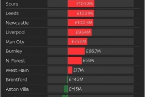 2025年夏季英超俱樂部轉(zhuǎn)會凈支出榜