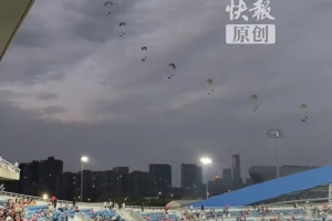 8架動(dòng)力傘當(dāng)天在丹徒長(zhǎng)山飛行營(yíng)地起飛后在空中集結(jié) ,其中4架動(dòng)力傘懸掛國(guó)旗 ,2架動(dòng)力傘懸掛鎮(zhèn)江隊(duì)旗 ,2架懸掛南京隊(duì)旗。在空中排成各種隊(duì)形在體育場(chǎng)上空編隊(duì)表演 。