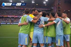 體育資訊09月01日訊 尤文vs熱那亞第73分鐘,弗拉霍維奇頭球破門,全隊簇擁著他慶祝!此時比分變?yōu)橛任?-0!