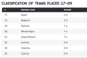 本屆賽事17到24名的排名也最終確定,分別是西班牙、比利時、愛沙尼亞、黑山、英國、冰島、捷克和塞浦路斯。