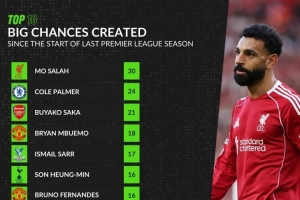 體育資訊9月7日訊 WhoScored列出了英超上賽季至今創(chuàng)造重大機(jī)會(huì)榜,薩拉赫30次居首,帕爾默、薩卡二三位。
