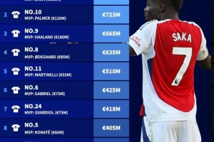 1、7號:球員總身價7.71億歐元,薩卡1.5億歐最高